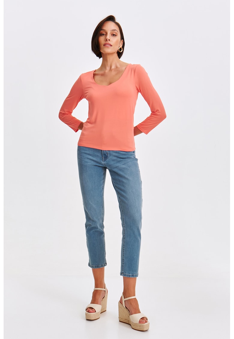 Caracteristici Culoare: piersica Imprimeu: uni Stil: casual Croiala: regular fit Sistem inchidere: fara inchidere Material: sintetic Decolteu: amplu Lungime maneca: maneca trei sferturi Compozitie Exterior: 97% poliester – 3% elastan