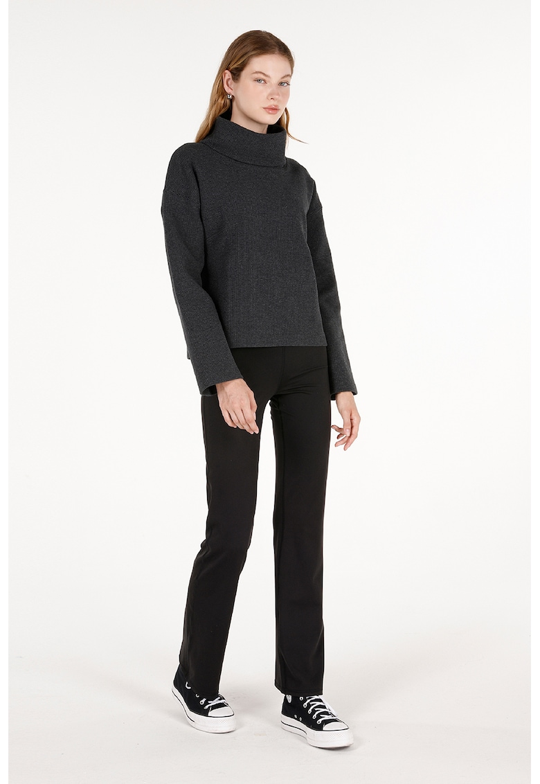 Caracteristici Culoare: gri antracit Imprimeu: uni Stil: casual Croiala: regular fit Sistem inchidere: fara inchidere Material: poliester – bumbac Decolteu: guler inalt – rasucit Lungime maneca: maneca lunga Compozitie Exterior: 85% bumbac – 13% poliester – 2% elastan