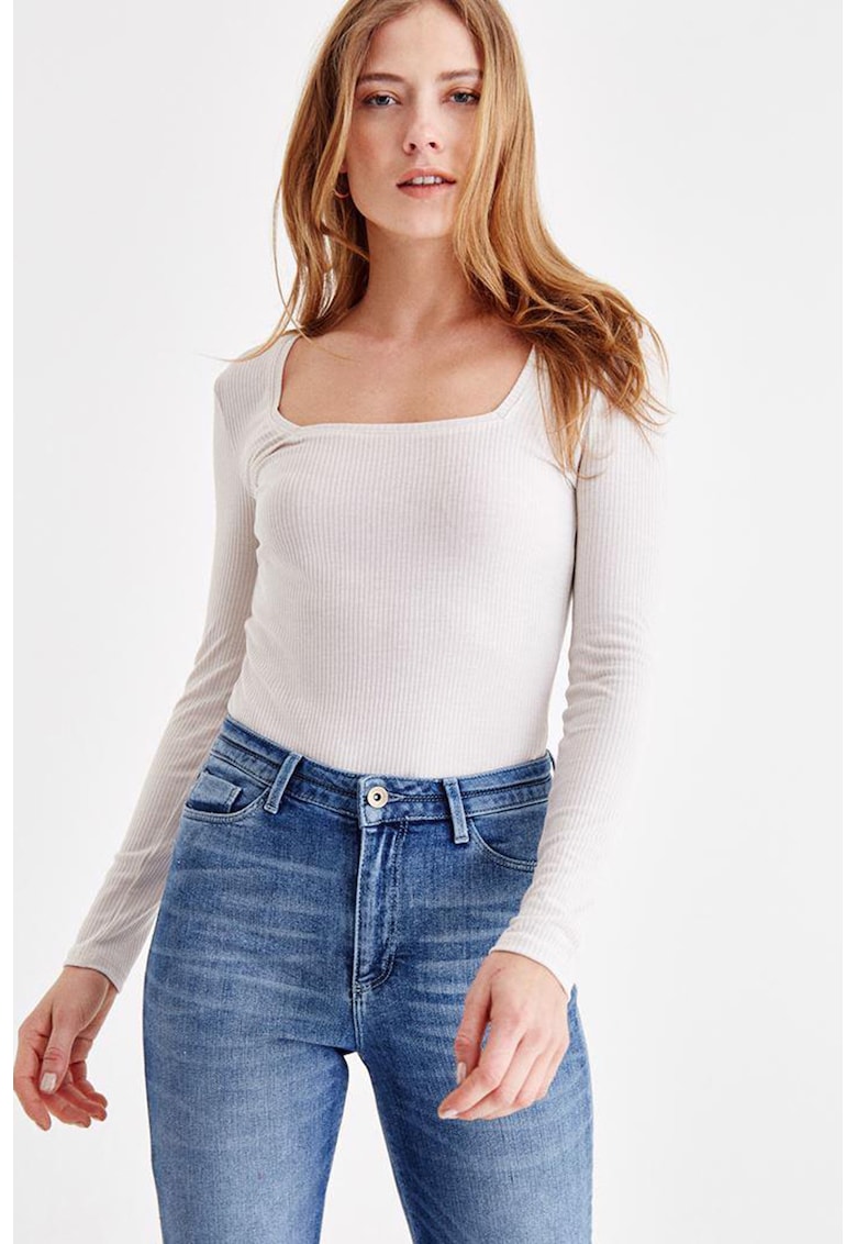 Caracteristici Culoare: alb fildes Imprimeu: uni Stil: casual Croiala: slim fit Sistem inchidere: fara inchidere Material: poliester – viscoza Decolteu: patrat Lungime maneca: maneca lunga Compozitie Exterior: 62% poliester – 34% viscoza – 4% elastan