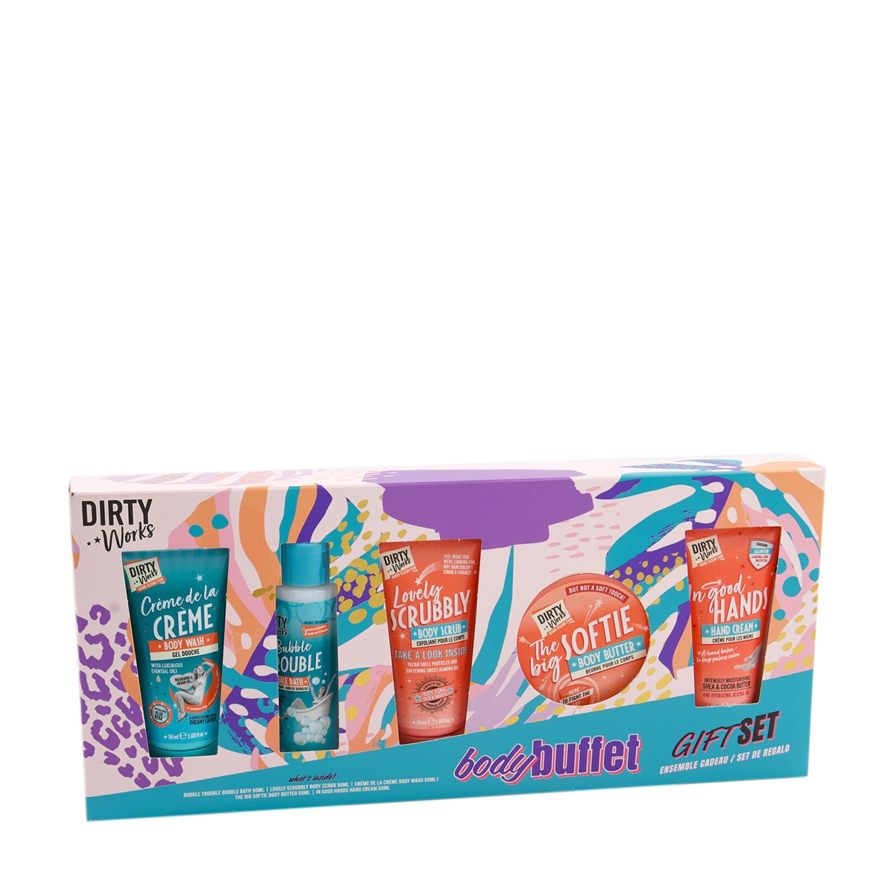 Dirty Works înțelege că timpul dedicat răsfățului poate face diferența în ziua ta. Gama accesibilă de produse Washing & Bathing, Gift, și Skincare deține trei valori esențiale – parfumate, distractive și fabuloase. Body Buffet Gift Set este colecția perfectă pentru momentele când ai nevoie de un „pick-me-up”! Setul include produse esențiale pentru îngrijirea completă a pielii, fiecare formulat cu ingrediente de top pentru o senzație de răsfăț și hidratare intensă. Acest set aduce o îngrijire completă a corpului, lăsându-te cu o piele catifelată și revitalizată!