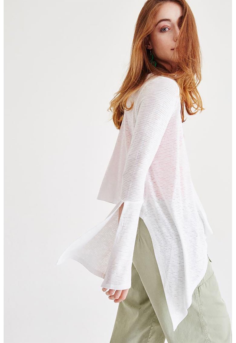 Caracteristici Tip produs: cardigan Culoare: alb – alb fildes Imprimeu: uni Material: poliester – viscoza Croiala: asimetric Sistem inchidere: fara inchidere Lungime maneca: maneca lunga Tip maneca: evazata – cu slituri Detalii: semitransparenta Compozitie Exterior: 65% poliester – 35% viscoza