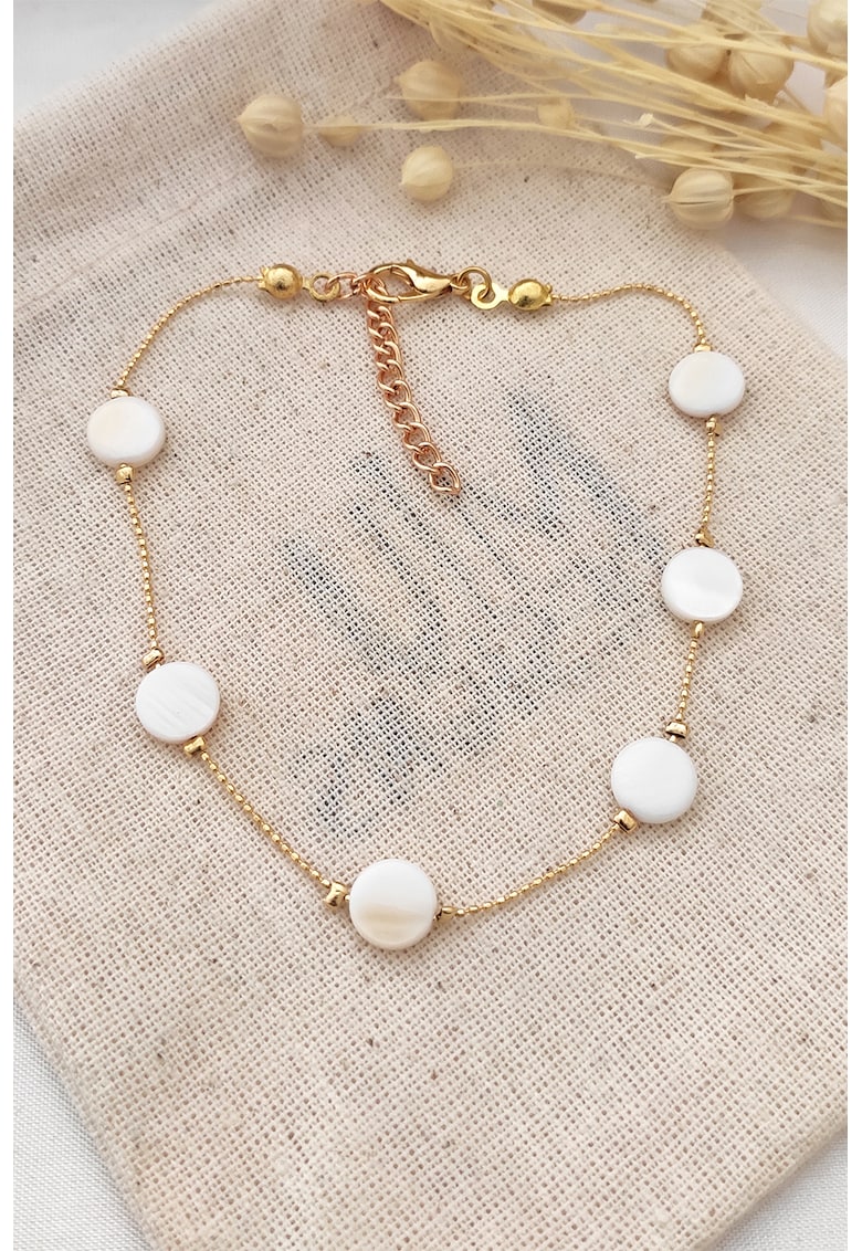 Caracteristici Tip produs: bratara Material: alama Culoare: alb – auriu Detalii: a se evita socurile termice si mecanice – zgarierea – contactul cu alcool – parfum – acetona – detergent – suprafete abrazive. – decorat cu perle sintetice Sistem inchidere: lobster Ambalaj: produsul se livreaza in ambalaj personalizat. Compozitie Compozitie: alama Pietre: perle sintetice Placaj: pvd Dimensiuni Lungime: 18