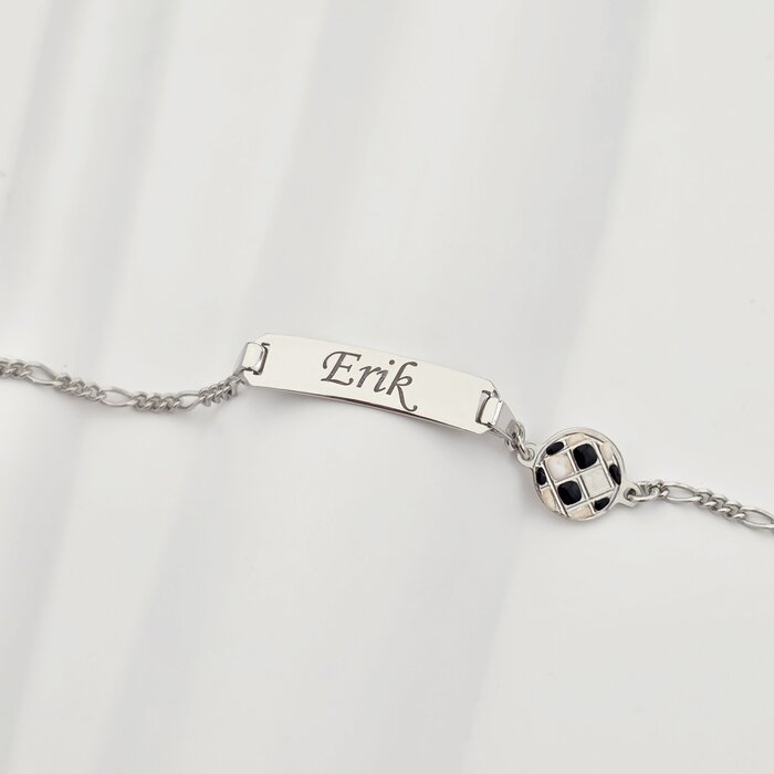 Bratara bebe – Placuta cu nume – Simbol minge de fotbal si lantisor – Argint 925 face parte din categoria Landing Page Categorii >> Bebe si Botez >> Bratari bebe Argint >> Promoții >> Noutati de la brandul ChicBijoux.
