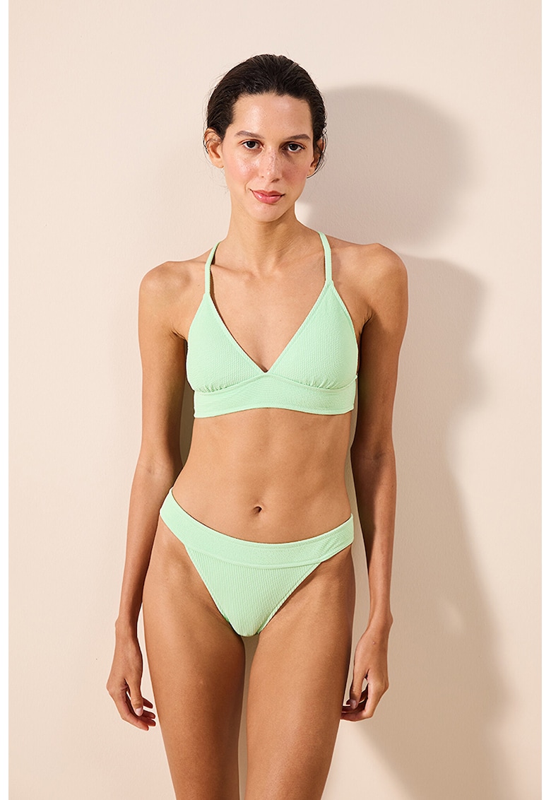 Detalii generale Tip produs: bustiera Culoare: verde pal Imprimeu: uni Forma cupa: triunghi Material: sintetic Barete: ajustabile – incrucisate pe partea din spate Sistem inchidere: fara inchidere Design Tip sutien: burete detasabil Sustinere metalica: fara sarma Compozitie Exterior: 89% poliester – 11% elastan