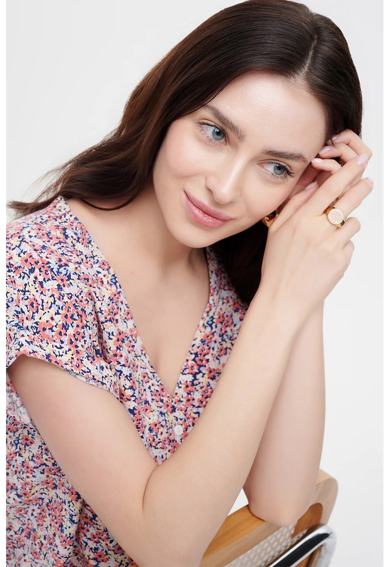 Caracteristici Culoare: galben – portocaliu stins – albastru Imprimeu: floral Stil: casual Material: viscoza Croiala: regular fit Lungime maneca: maneca scurta Sistem inchidere: nasturi Compozitie Exterior: 100% viscoza