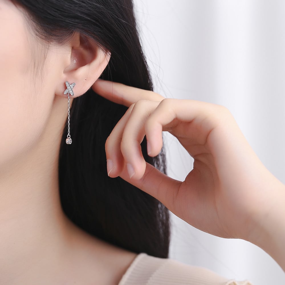 cercei de argint 925, placati cu rodiu; inchidere: inchidere tip surub ; material piatra: zirconiu; dimensiune: 3.9 x 0.6 cm; greutate: 1.64 g; finisaje premium de lux. Ingrijirea bijuteriilor : Dupa purtare va recomandam sa pastrati bijuteriile in ambalajul original sau intr-un saculet dintr-un material moale, pentru a evita zgarieturile. Pentru a le reda stralucirea este necesar sa le stergeti cu o carpa moale sau cu solutii speciale pentru curatarea argintului. Inainte de culcare, baie sau activitati similare in care bijuteriile ar intra in contact cu apa, produse cosmetice, detergenti, corozive sau chimice, scoateti bijuteriile deoarece aceste produse pot decolora sau modifica stralucirea. Evitati loviturile bruste deoarece ar putea cauza zgarieturi, ciobiri si alte daune si nu lipiti cristalele dezlipite cu adezivi tip super glue, picatura sau orice alt tip.
