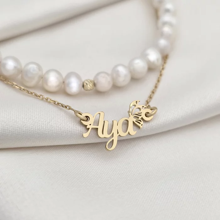 Lantisor cu Nume – Font Elegant & Fluturas – Combinat cu Sirag de Perle – Argint 925 placat cu Aur Galben 18K face parte din categoria Colectii >> Comori Perlate >> Noutati de la brandul ChicBijoux.
