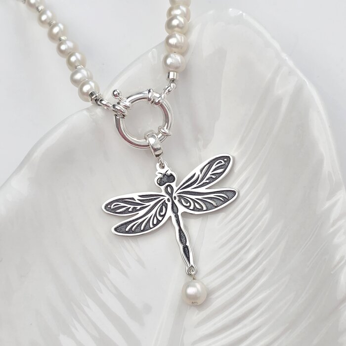Lantisor cu Perle – pandantiv libelula – Model sirag de perle albe cu bilute si lantisor – Argint 925 face parte din categoria Colectii >> Comori Perlate >> Noutati de la brandul ChicBijoux.