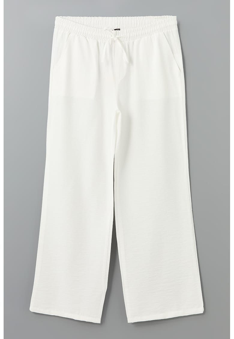 Caracteristici Culoare: alb Stil: casual Material: viscoza – poliamida Imprimeu: uni Croiala: croiala ampla Lungime: crop Talie: inalta Detalii: banda elastica in talie cu snur pentru ajustare Buzunare: 2 oblice Sistem inchidere: fara inchidere Compozitie Exterior: 90% viscoza – 10% poliamida