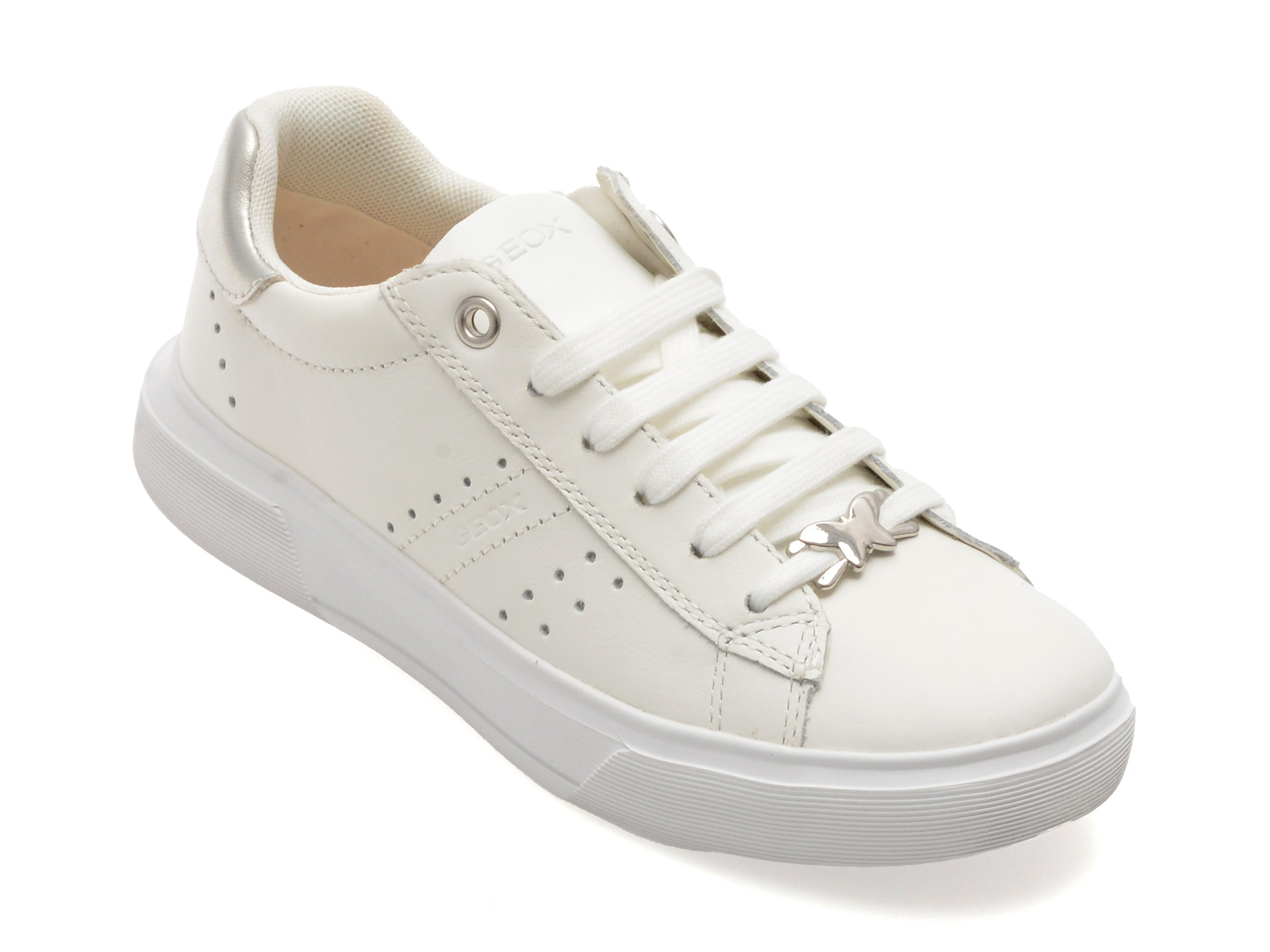 Pantofi sport GEOX albi, J45GCB, din piele naturala , Pentru: Fetite , Brand: Geox , culoare: Alb , Material exterior: Piele naturala , Material talpa: Cauciuc termoplastic , Tip inchidere: Siret . Livrare gratuita pentru comenzile de peste 299 RON acasa si in locker. Retur gratuit de acasa sau in locker.