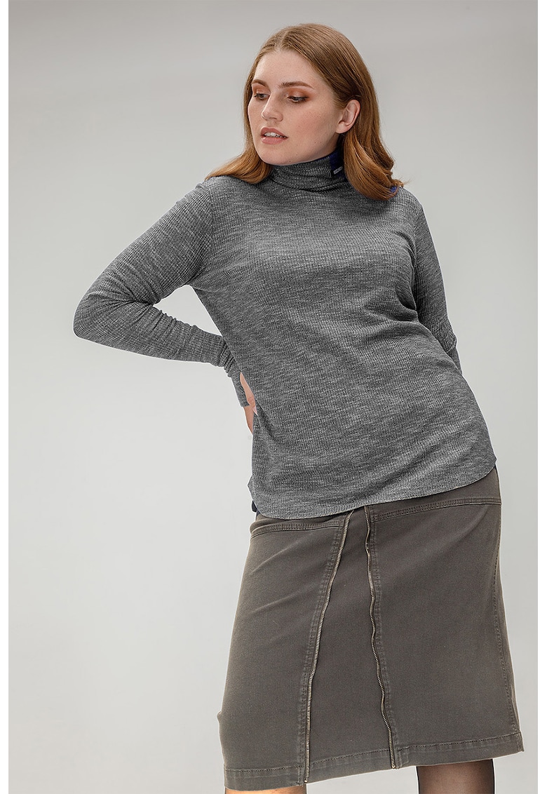 Caracteristici Tip produs: pulover Culoare: gri melange Imprimeu: uni Material: sintetic Model: guler inalt Croiala: regular fit Sistem inchidere: fara inchidere Lungime maneca: maneca lunga Detalii: slituri pentru degete Compozitie Exterior: 48% viscoza – 47% poliester – 5% spandex