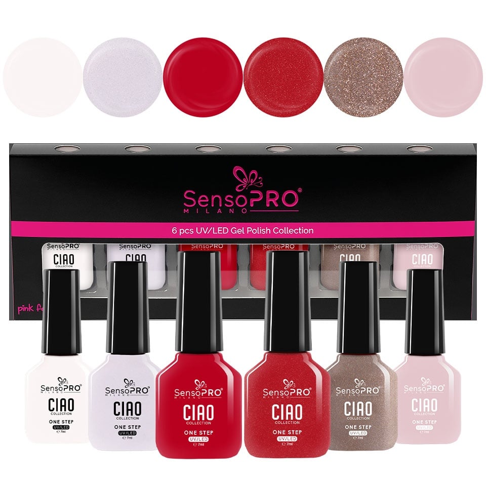 Alege Set 6 Oje Semipermanente CIAO One Step SensoPRO Milano, Duo Paradise pentru manichiuri ce iti pun in valoare stilul dinamic, creativitatea si personalitatea unica. ✅ 1 x Oja Semipermanenta CIAO – Red Sparkle 7ml – vezi nuanta ✅ 1 x Oja Semipermanenta CIAO – Pearl Essence 7ml – vezi nuanta ✅ 1 x Oja Semipermanenta CIAO – Champagne Gold 7ml – vezi nuanta ✅ 1 x Oja Semipermanenta CIAO – Royal Lips 7ml – vezi nuanta ✅ 1 x Oja Semipermanenta CIAO – Cozy Cocoa 7ml – vezi nuanta ✅ 1 x Oja Semipermanenta CIAO – White Shine 7ml – vezi nuanta Oja Semipermanenta are o consistenta cremoasa, este usor de aplicat si este recomandata atat pentru unghiile tehnice cu gel / acryl cat si pentru cele naturale. Avantaje: ✅ Aplicare fara base coat & top coat ✅ Nuante pigmentate ✅ Aplicare usoara ✅ Rezistenta indelungata ✅ Pensula & sticluta Mod de aplicare: – Curatati unghia naturala si matuiti-o cu o pila buffer – Aplicati un strat de primer si uscati la aer 60s – Aplicati un strat de oja si uscati in lampa LED 60s / lampa UV 120s. Optional, aplicati al doilea strat si polimerizati. Cantitate: 7ml x 6 buc
