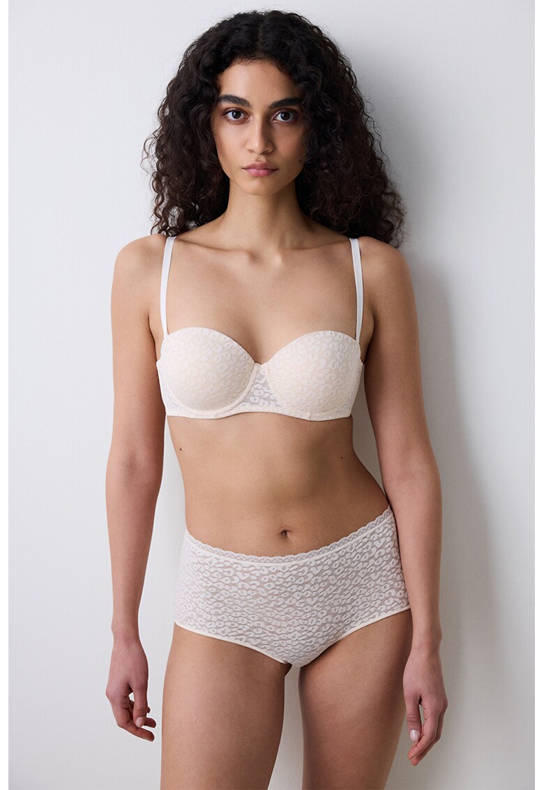 Caracteristici Tip produs: sutien Culoare: crem Material: poliester Imprimeu: animal print Barete: ajustabile Forma cupa: push up Burete cupa: cu burete Sustinere metalica: cu sarma Compozitie Exterior: 93% poliester – 7% elastan