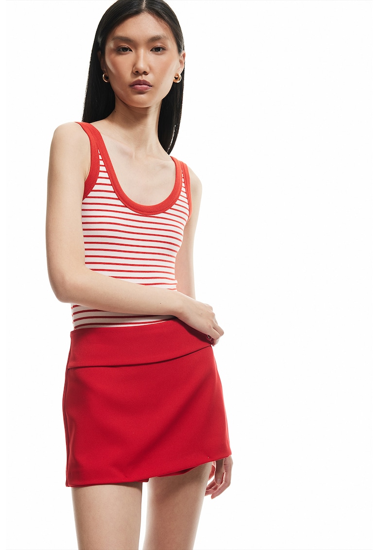 Caracteristici Culoare: rosu – crem Imprimeu: dungi Material: poliester – viscoza Croiala: slim fit Model: rotund Lungime maneca: fara maneca Compozitie Exterior: 62% poliester – 35% viscoza – 3% elastan