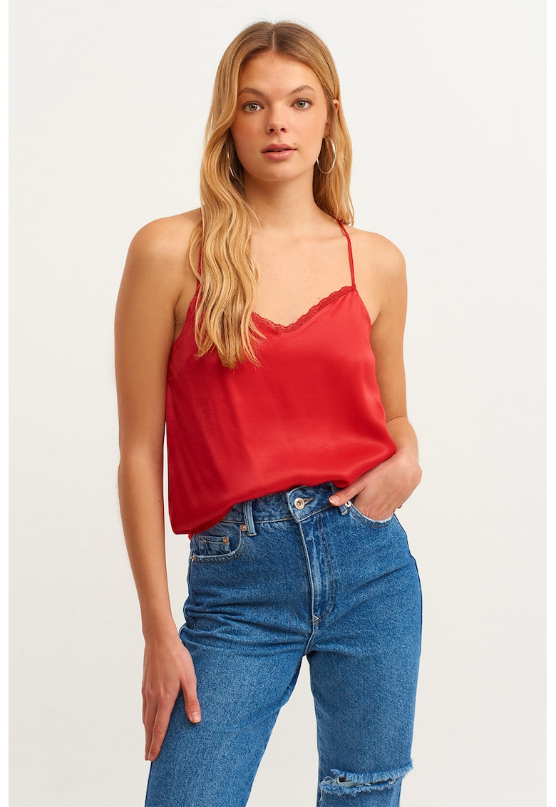 Caracteristici Tip produs: top Culoare: rosu Imprimeu: uni Material: viscoza Croiala: regular fit Detalii: aspect de satin – detaliu din dantela Compozitie Exterior: 100% viscoza