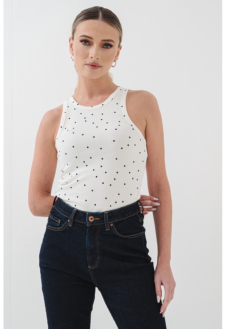 Caracteristici Culoare: alb – negru Imprimeu: animal print Material: bumbac Croiala: regular fit Model: rotund Lungime maneca: fara maneca Compozitie Exterior: 93% bumbac – 7% elastan Info model Modelul poarta un produs de marimea S/36 EU. Marimi model: 174 cm inaltime – 84 cm bust – 64 cm talie – 90 cm sold