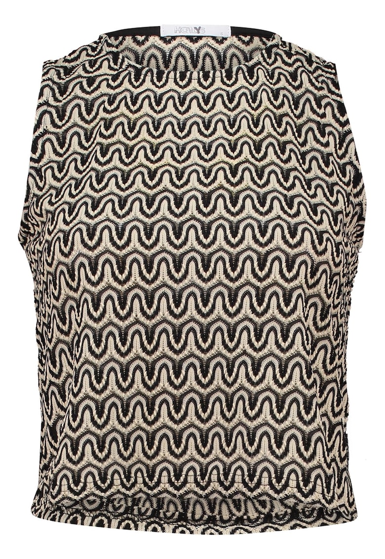 Caracteristici Culoare: negru – bej Imprimeu: dungi Material: poliester Croiala: crop Model: decolteu la baza gatului Lungime maneca: fara maneca Compozitie Exterior: 100% poliester