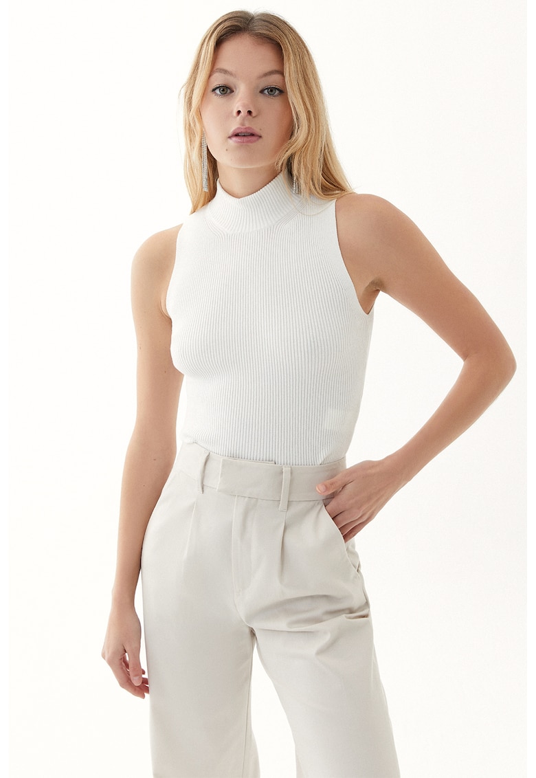 Caracteristici Culoare: alb Material: jerseu Croiala: slim fit Guler: guler inalt Lungime maneca: fara maneca Detalii: aspect striat Compozitie Exterior: 72% viscoza – 28% poliester