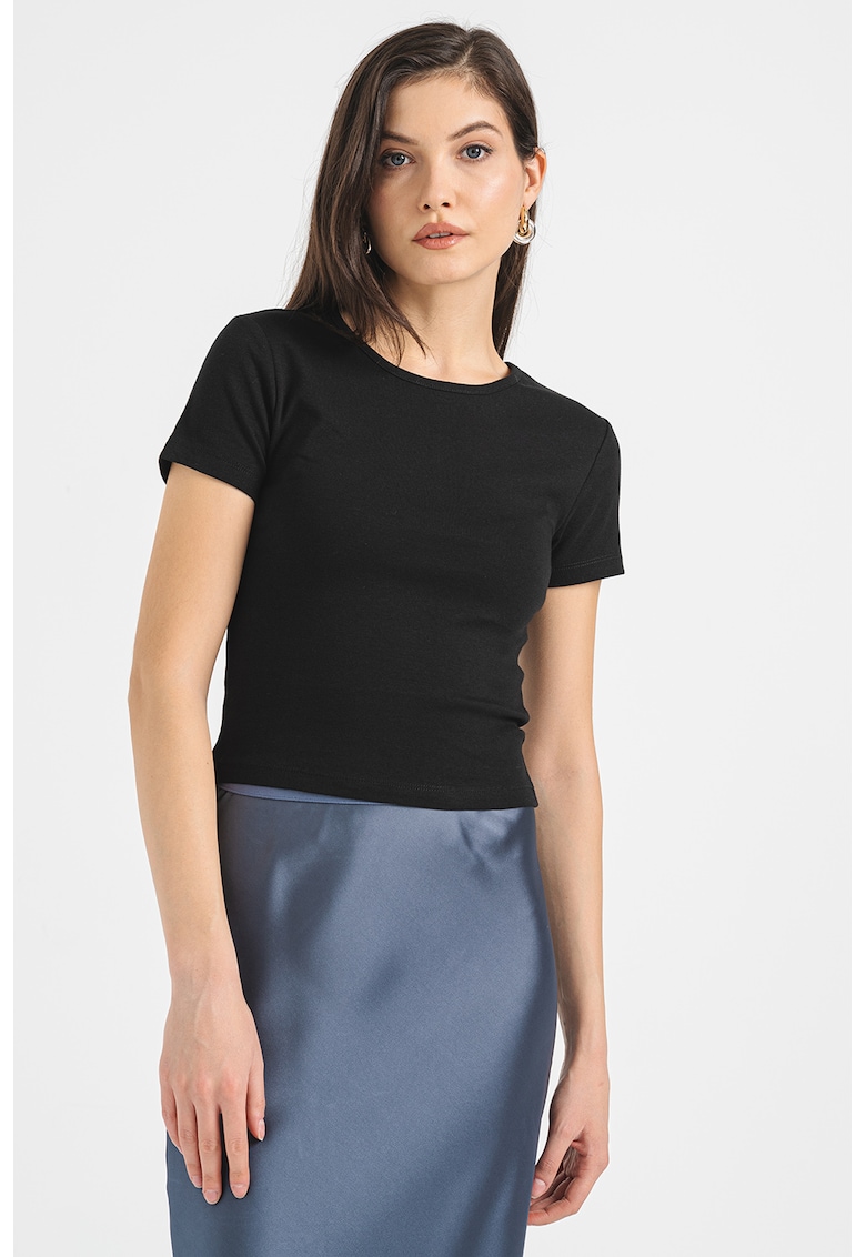 Caracteristici Culoare: negru Imprimeu: uni Material: bumbac organic Croiala: crop Model: decolteu la baza gatului Lungime maneca: maneca scurta Compozitie Exterior: 94% bumbac organic – 6% elastan Info model Modelul poarta un produs de marimea S. Marimi model: 176 cm inaltime – 78 cm bust – 67 cm talie – 95 cm sold