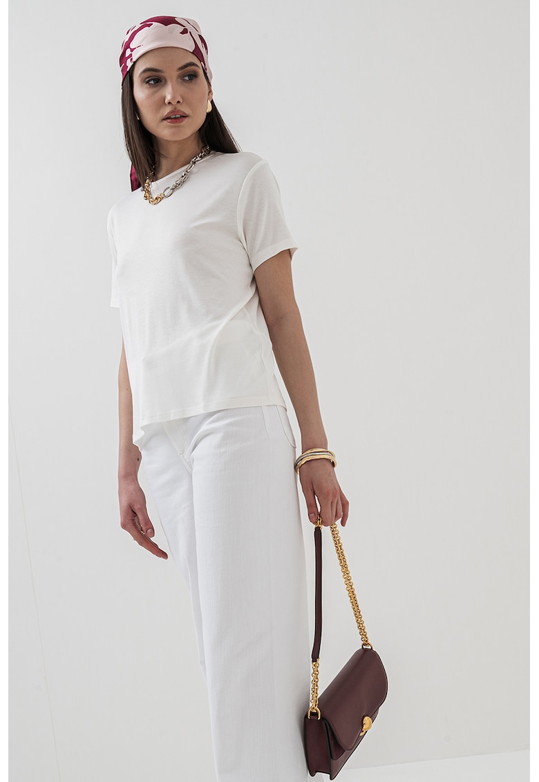 Caracteristici Culoare: alb murdar Imprimeu: uni Material: viscoza Croiala: regular fit Model: decolteu la baza gatului Lungime maneca: maneca scurta Compozitie Exterior: 95% viscoza – 5% elastan Info model Modelul poarta un produs de marimea S. Marimi model: 176 cm inaltime – 78 cm bust – 67 cm talie – 95 cm sold