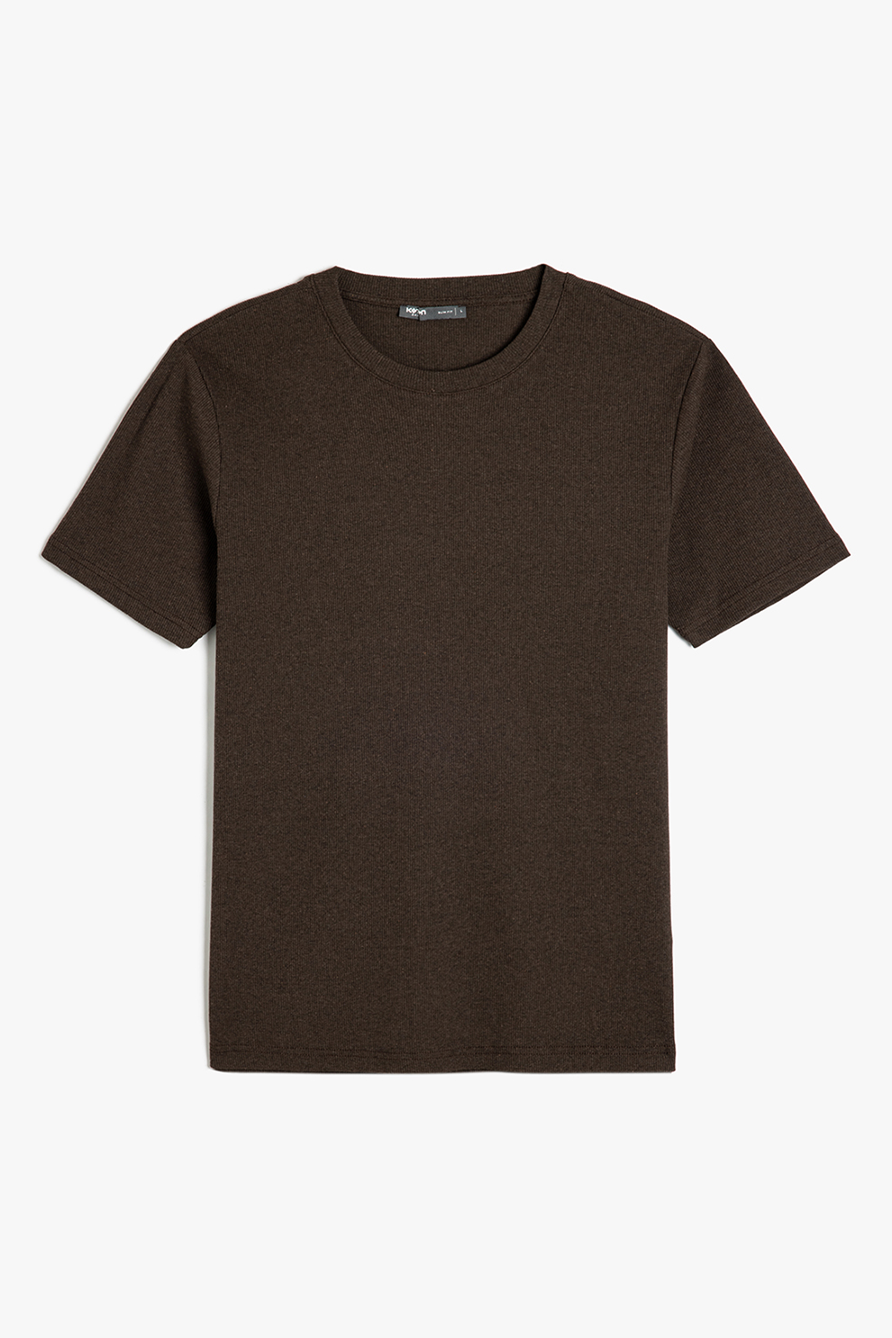 Caracteristici Culoare: maro inchis Imprimeu: uni Material: sintetic – bumbac Croiala: regular fit Model: decolteu la baza gatului Lungime maneca: maneca scurta Detalii: aspect striat Compozitie Exterior: 48% bumbac – 46% poliester – 6% elastan