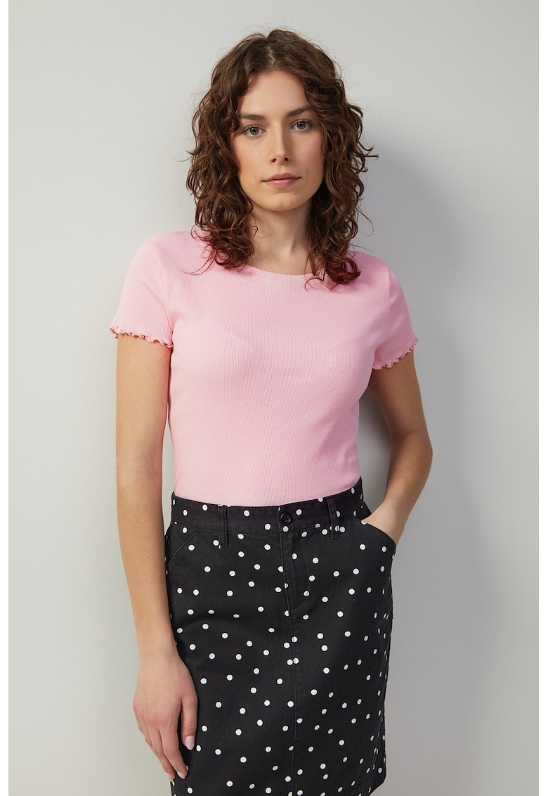 Caracteristici Culoare: roz pastel Imprimeu: uni Material: bumbac Croiala: regular fit Model: decolteu la baza gatului Lungime maneca: maneca scurta Compozitie Exterior: 93% bumbac – 7% elastan