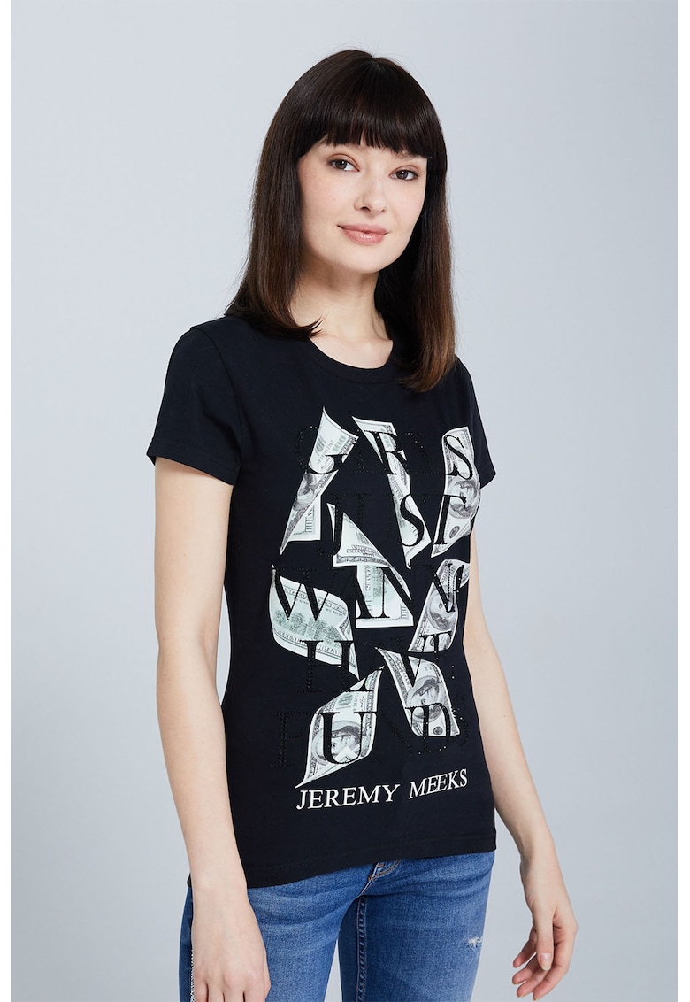 Caracteristici Culoare: negru Imprimeu: grafic Material: sintetic – bumbac organic Croiala: regular fit Model: decolteu la baza gatului Lungime maneca: maneca scurta Detalii: aplicatii din strasuri Compozitie Exterior: 96% bumbac organic – 4% elastan