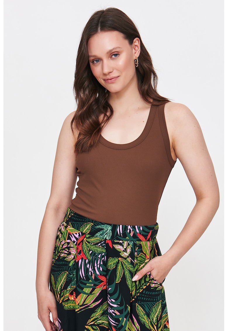 Caracteristici Culoare: maro taupe Imprimeu: uni Material: poliester Croiala: regular fit Model: rotund Lungime maneca: fara maneca Compozitie Exterior: 92% poliamida – 8% elastan