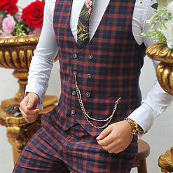 Compleu barbati slim-fit vesta si pantalon bleumarin in carouri caramizii – CU111